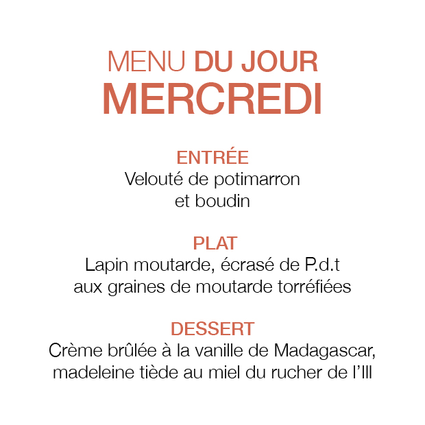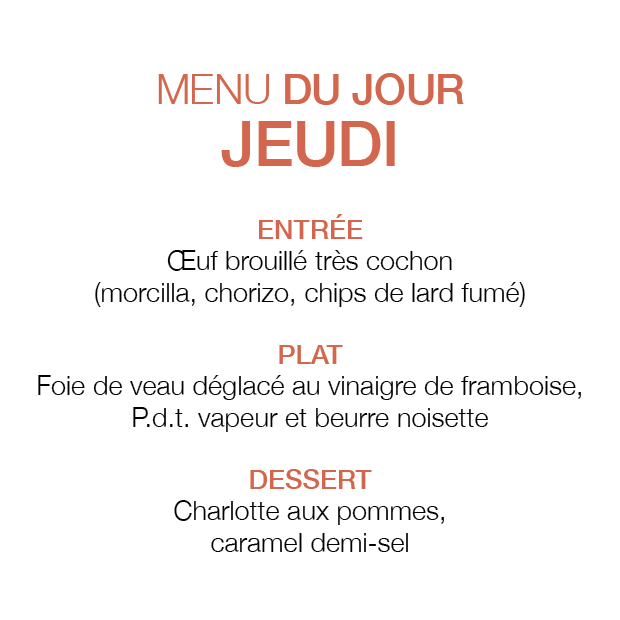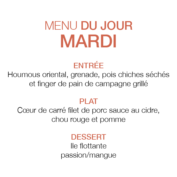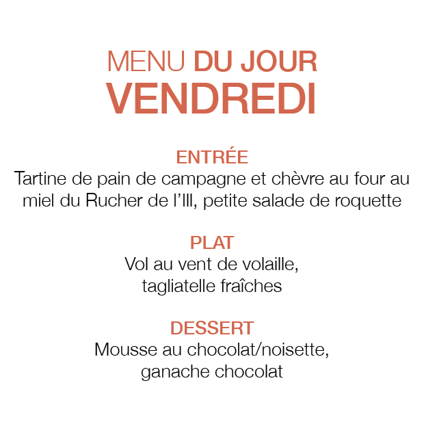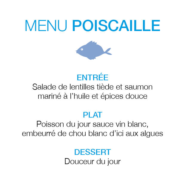 Classique, Végétarien, ou Poissons, le chef vous propose chaque midi, du mardi au vendredi, 3 menus du jour ! Découvrez chaque semaine sur cette page les menus du jour, et si le cœur vous en dit, réservez une table pour le midi qui vous tente le plus.