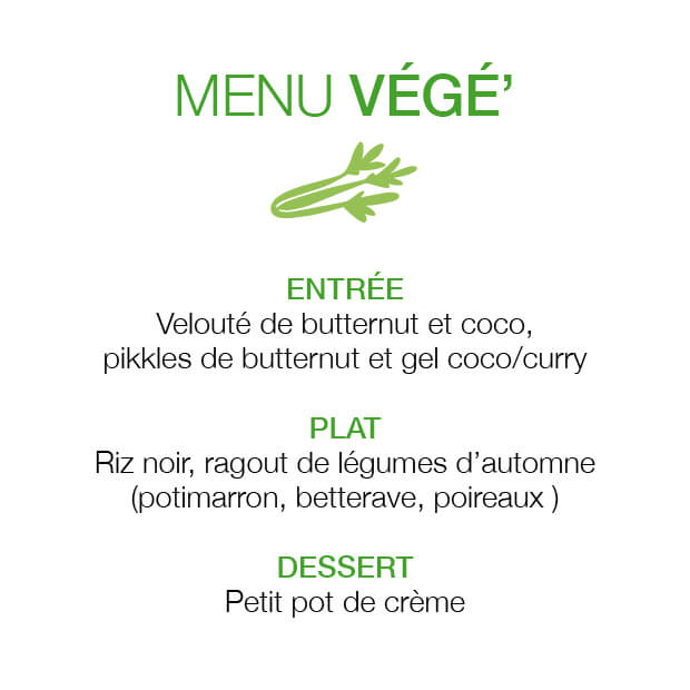 choisir l’entrée Poisson, puis le plat Végétarien et le dessert du Jour par exemple