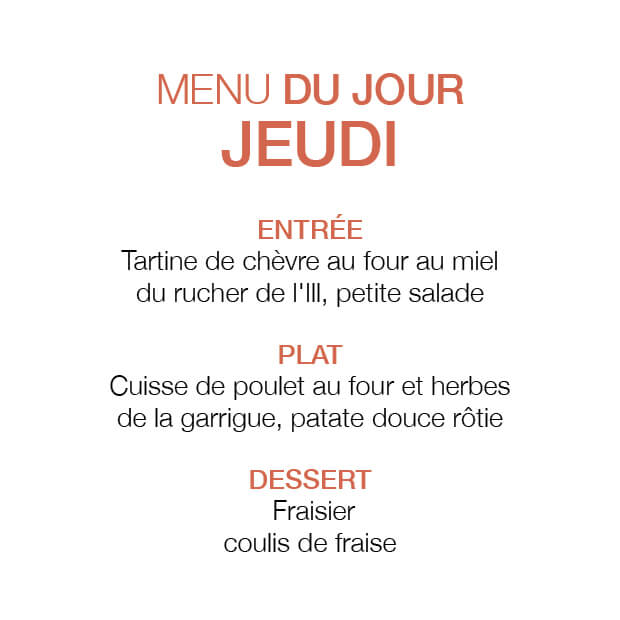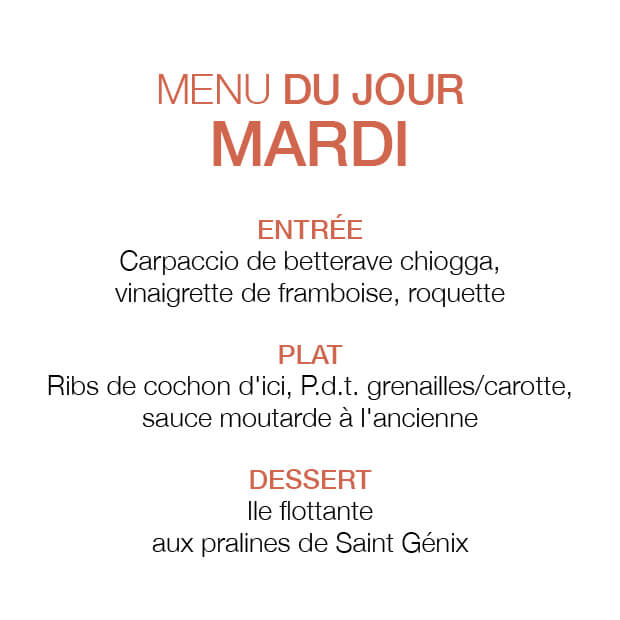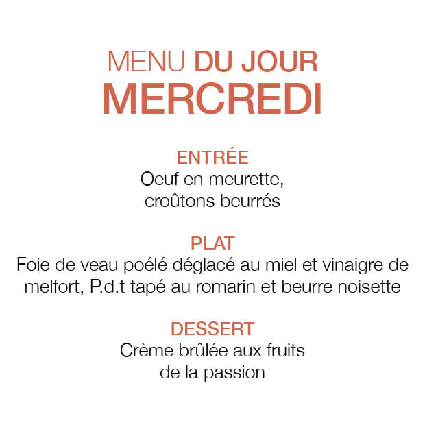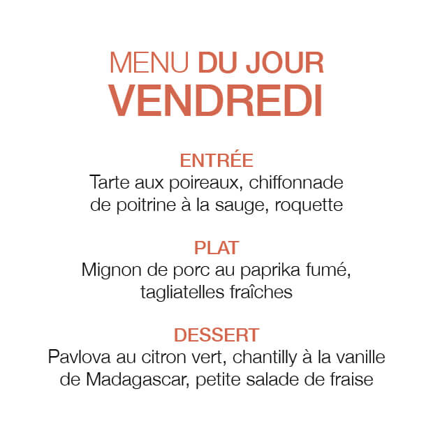 Classique, Végétarien, ou Poissons, le chef vous propose chaque midi, du mardi au vendredi, 3 menus du jour ! Découvrez chaque semaine sur cette page les menus du jour, et si le cœur vous en dit, réservez une table pour le midi qui vous tente le plus.